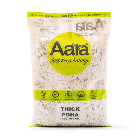 Aara Thick Poha is made from flattened rice flakes that cook quickly and absorb flavors well. It is widely used in Indian breakfast dishes such as poha and chivda.