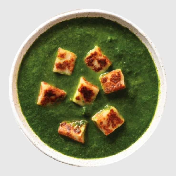 Fresh Paneer in Seasoned Spinach Sauce Delight in the vibrant flavors of Palak Paneer. Soft cubes of fresh cow’s milk cheese, or ‘paneer,’ simmered slowly in a smooth spinach sauce, gently seasoned with Indian spices, onions, tomatoes, ginger, garlic, and a hint of green chillies. Served with fragrant Basmati Rice and Pea Pilaf.