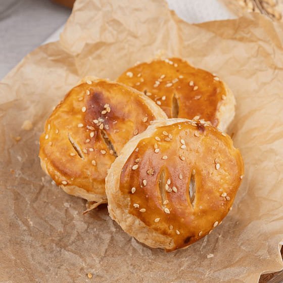 Traditional pastries filled with sweet winter melon filling. They have a flaky crust and soft, chewy center. A beloved classic treat with a delicate sweetness.